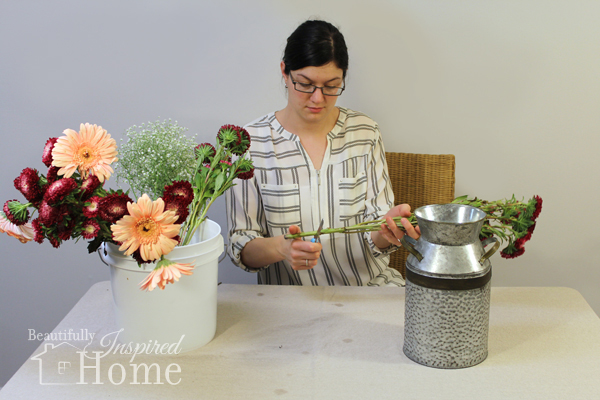 Trim the stems at an angle. Your stems should be about 1 1/2 times taller than the vase (the milk can in this case). Leave the Gerber daisies a little longer than the mums so they pop out.