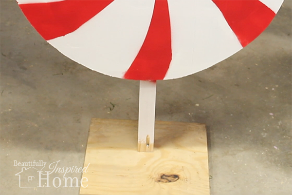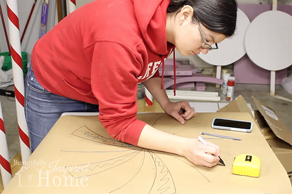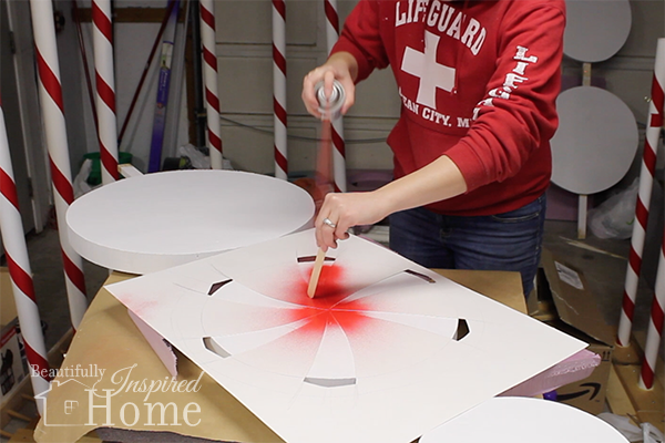 I made a template of the peppermint swirl so I could spray on the red. You could also paint the swirls by hand if you prefer. The template was 25″ across with 6 swirls cut out. Be sure to use a rigid material like poster board or cardboard.