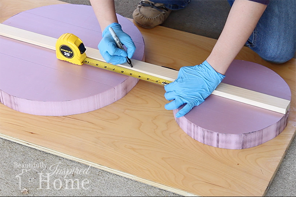 Once you and the pieces are clean, lay out the circles on the ground for a test fitting. Space the circles 5″ apart from each other with the smallest circle flush with the end of the board. Mark the edge of each circle on the wood then remove the wood from the channel. The marks will make realigning the circles after glueing a snap!