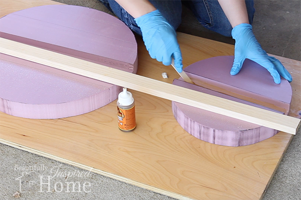 Next I made two large bows and attached them with a chenille stem to the wood. You can find my tutorial on how to make these bows here: http://beautifullyinspiredhome.com/how-to-make-a-two-ribbon-bow/